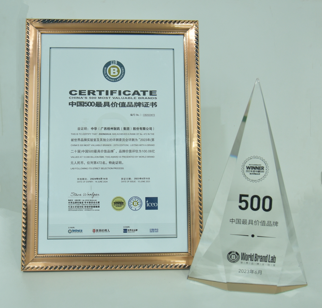 廣西梧州制藥(集團)股份有限公司“中華品牌”獲評中國500最具價值品牌,品牌價值評估為100.06億人民幣。