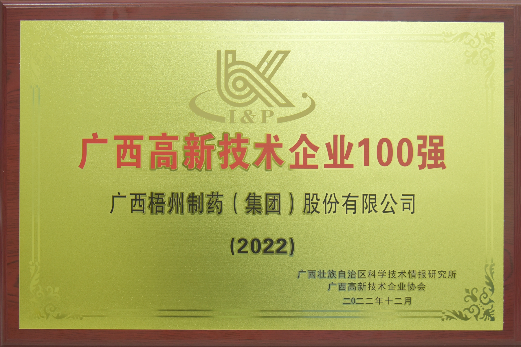 廣西梧州制藥(集團)股份有限公司獲評廣西高新技術企業(yè)100強【2022】