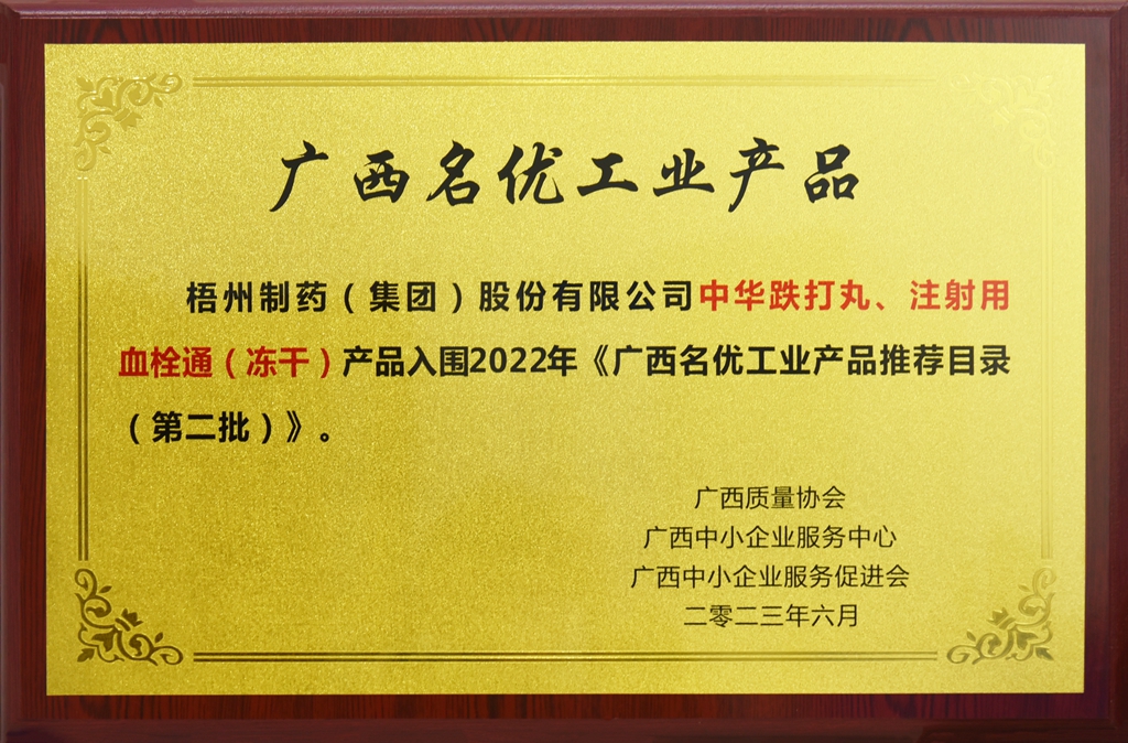 廣西梧州制藥(集團)股份有限公司中華跌打丸、注射用血栓通(凍干)產(chǎn)品入圍2022年《廣西名優(yōu)工業(yè)產(chǎn)品推薦目錄(第二批)》
