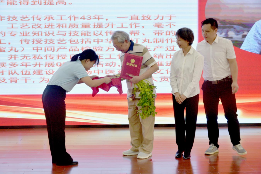 活動(dòng)還專門邀請(qǐng)了中華跌打丸獻(xiàn)方人陳鐵的兒子,現(xiàn)已83歲高齡的原跌打丸生產(chǎn)車間主任陳永強(qiáng)到會(huì),由公司黨委書記、董事長黃文彩為其頒發(fā)“中華跌打丸制作技藝——金牌師父”榮譽(yù)稱號(hào)。“中華跌打丸制作技藝”的第三、第四、第五代非遺傳承人依次上臺(tái),同樣用傳統(tǒng)的束脩六禮對(duì)陳老進(jìn)行了謝師,以此來表達(dá)對(duì)師父的感激之情、教導(dǎo)之恩。