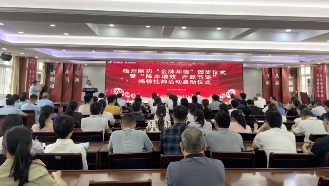 4月24日上午,一場感恩與奮進(jìn)的“金牌師徒”頒獎(jiǎng)儀式暨“降本增效 開源節(jié)流”揭榜掛帥活動(dòng)啟動(dòng)儀式隆重舉行。梧州制藥領(lǐng)導(dǎo)班子成員,各部門、各車間職工代表,及獲評(píng)星級(jí)的“金牌師徒”共150余人參加活動(dòng)。