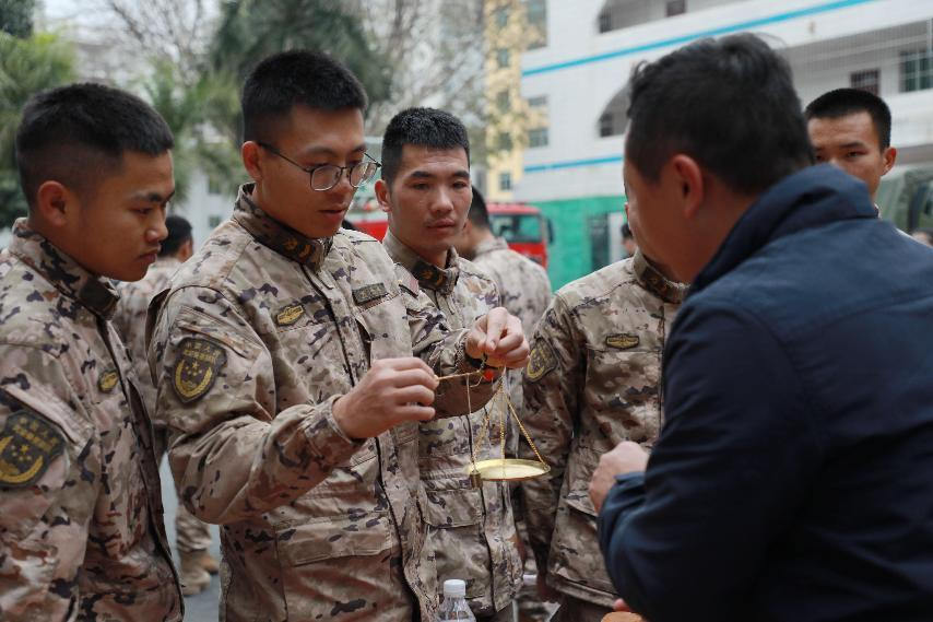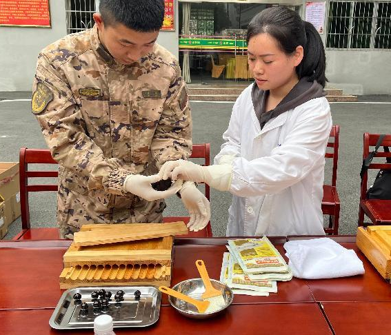 戥子、杵臼、搓丸板,這些平日很少接觸到的中藥傳統(tǒng)制藥工具,觸發(fā)起武警官兵們強烈的好奇心和探知欲,興致勃勃地嘗試操作,紛紛參與體驗中華跌打丸制作技藝,從制丸條到成功搓制成丸,每一道工序無不感受著非遺文化獨特的魅力。