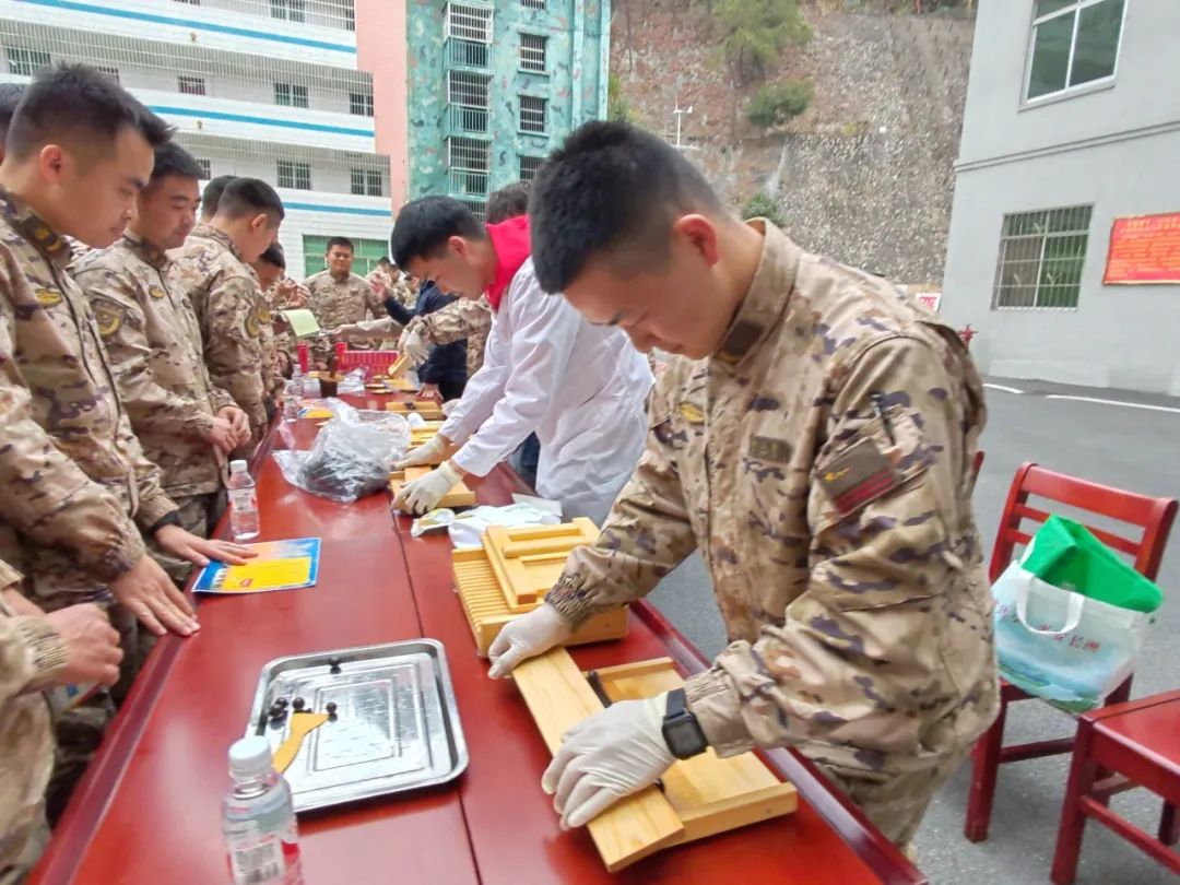 “把藥坨搟成長圓條……”“一邊按著一邊搟!”熱鬧非凡的軍營里,中華跌打丸制作技藝傳承人和徒弟們演示傳統(tǒng)搓丸技藝,手把手地教授武警官兵們使用傳統(tǒng)制藥工具搓丸板,親手制作中華跌打丸大蜜丸。